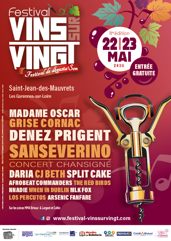 Fidèle à son ADN, le Vins sur Vingt mêlera artistes confirmés, découvertes et talents locaux, dans une ambiance conviviale et festive où la musique se vit autant qu’elle s’écoute. Vous l’aurez compris, c’est un artiste de renommée nationale qui nous fait l’honneur de sa présence : Sanseverino. À ses côtés, la touche bretonne sera portée par Denez Prigent, que certains ont découvert à travers la bande originale du film « La Chute du Faucon Noir ». Nous mettons également à l’honneur la scène angevine avec des artistes incontournables comme Grise Cornac et Madame Oscar. Sans oublier nos coups de cœur émergents, à l’image de CJ Beth, révélée notamment par l’émission The Voice, ainsi que nos talents locaux, MLK Fox et Nnadie.
